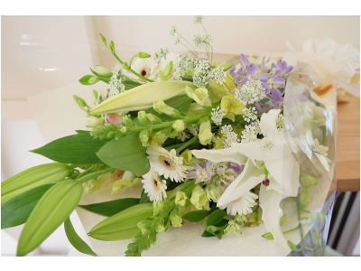 白メインに淡色の洋花でまとめたモダンな雰囲気の花束です。葬儀・通夜・法要・法事・お供え等にご利用頂けます。